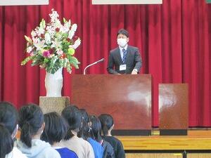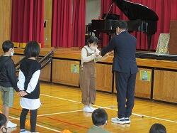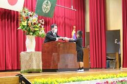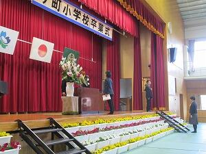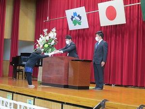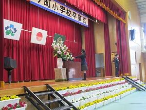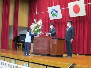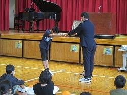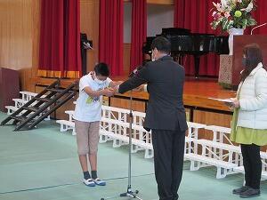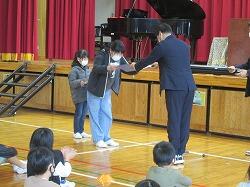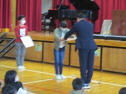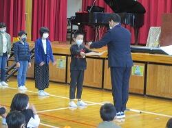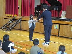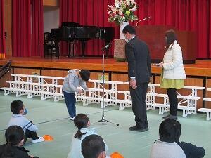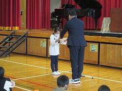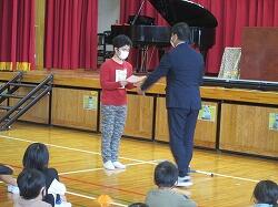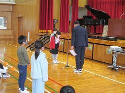 式の児童代表作文発表では、1年生が発表し、2学期がんばった持久走大会について発表がありました。そして3学期は、なわとびの練習をがんばりたいという抱負も述べていました。