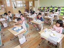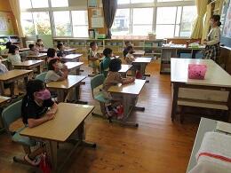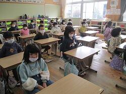 新1年生が入学して3日目になりました。小学校では教室でイスに座っての学習ですが、1年生はみんなきちんと座っていました。また、コロナウイルス感染対策のため、登校してから下校するまで1日中マスクを着けることができていました。初めての給食も、前を向いて黙って食べていました。とてもりっぱです。