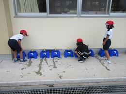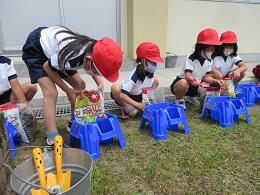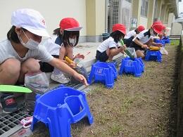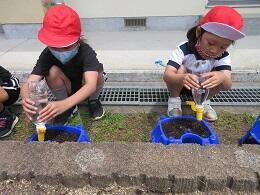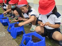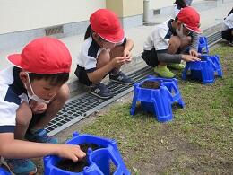 1年生は、生活科の学習で、あさがおの種まきをしました。1年生は、先生から種まきの説明を受け、校庭でそれぞれの鉢に土を入れ、5つぶずつ種をまき、水をやって、日当たりのよいところに並べました。「いつ芽がでるかな・・」「どんな花がさくかな・・」そんな期待をもちうれしそうな様子が見られました。あさがおが大きく育ってたくさんの花が咲くといいですね。