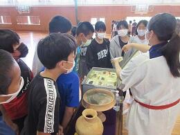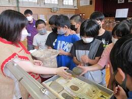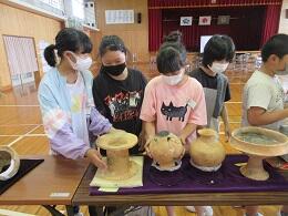 6年では、社会科の歴史学習で、都城市教育委員会文化財課の協力により、都城市で発掘された古代の土器や石器の実物に触れる学習をしました。6年生は、土器や石器の実物を見たり触ったりして、古代人の生活の様子を想像していました。実物に触れる体験はとても大事な学習です。文化財課の皆様、ありがとうございました。