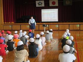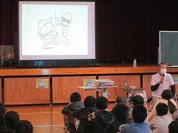1・2・3年生と4・5・6年生に分かれて、防犯教育学習を体育館で行いました。