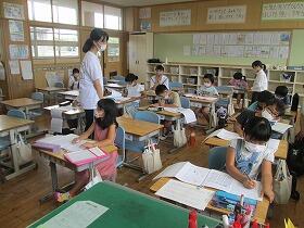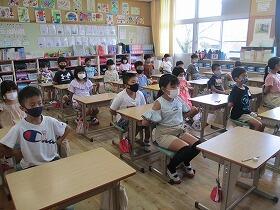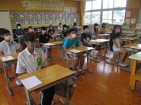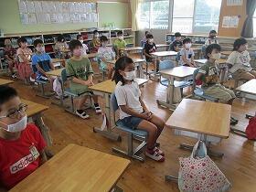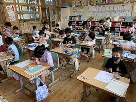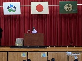 感染対策の為、今回は校内放送による始業式を行いました。5年生の代表児童の作文発表では、学習や2学期行事のことなどでがんばりたいことを堂々と発表していました。