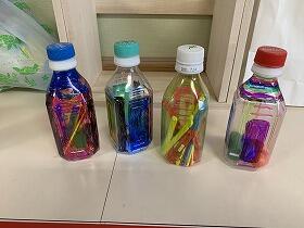 2年生が音楽の時間に、ペットボトルを使って音の鳴る楽器づくりに挑戦しました。350mlのペットボトルの口に、音の鳴る道具として準備したブロックや棒、おはじきなどを入れて音の重なりや響きを確認しながら作っていました。音の確認後は、ボトルそのものに装飾をしました。子どもたちは、様々な色のペンを使ってカラフルな色合いの楽器にしていました。完成後は、シャカシャカと音を出しながら楽しむ姿がみられました。