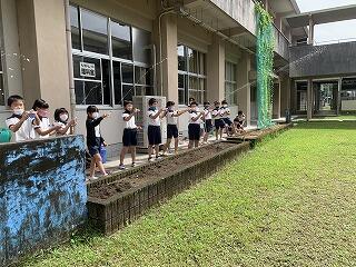 4年生が理科の授業で「とじこめた空気と水」という学習をしています。今日は、とじこめた水の働きを利用して水を飛ばす「水てっぽう」の実験をしました。