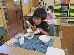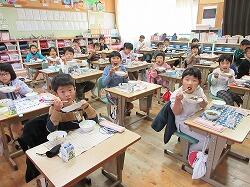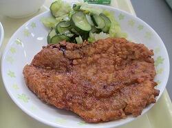 今日の給食は、「ふるさと給食」の日で、都城ブランド豚が出されました。「幸せ上々竜田揚げ」という献立名で、肉厚のメニューでした。