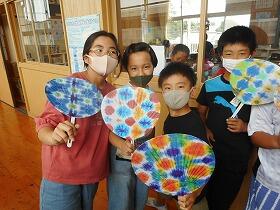 色水に折った紙を浸し、それを広げて乾かして団扇として作りました。オリジナルあふれる子どもらしい作品ができました。