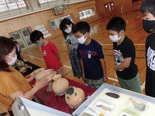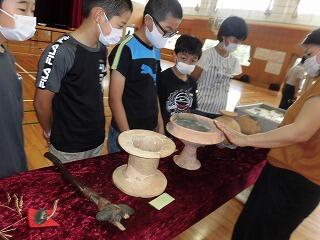 今町から出土した遺物も十数点持ってこられ、どのような使われ方をしたのか、どのようにして作ったのかなどをくわしく教えてもらいました。地元の遺物だったこともあり、子どもたちは興味津々で学んでいました。