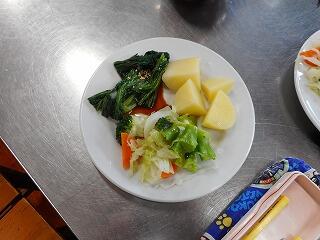 メニューは、ホウレンソウのおひたし、ゆでいも、ゆで野菜サラダ、フレンチソースです