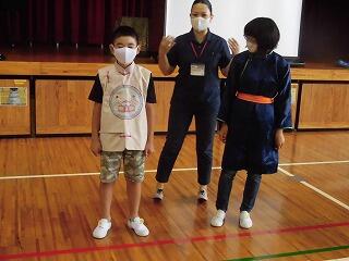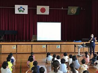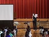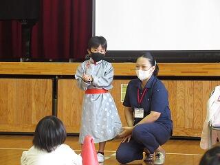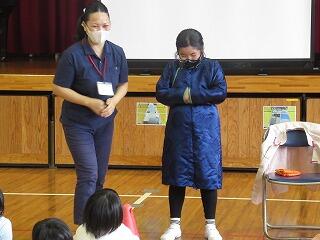 市の国際交流員の方に来ていただき、モンゴルと日本の違いや衣食住などの文化についてスライド写真や動画資料をもとに説明してもらいました。子どもたちは目を輝かせながら食い入るようにお話を聞いていました。最後は、モンゴルの民族衣装の紹介があり、多数の希望者が出る中、代表の子が袖を通し、夏は涼しく冬は暖かい機能的な衣装を実際に着ることで、その機能を実感していたようでした。