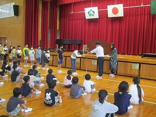 10月の全校で読書感想文・感想画に入賞した児童7名、都北地区サイエンスコンクール研究物の部門で金賞をとった2名の児童の表彰を行いました