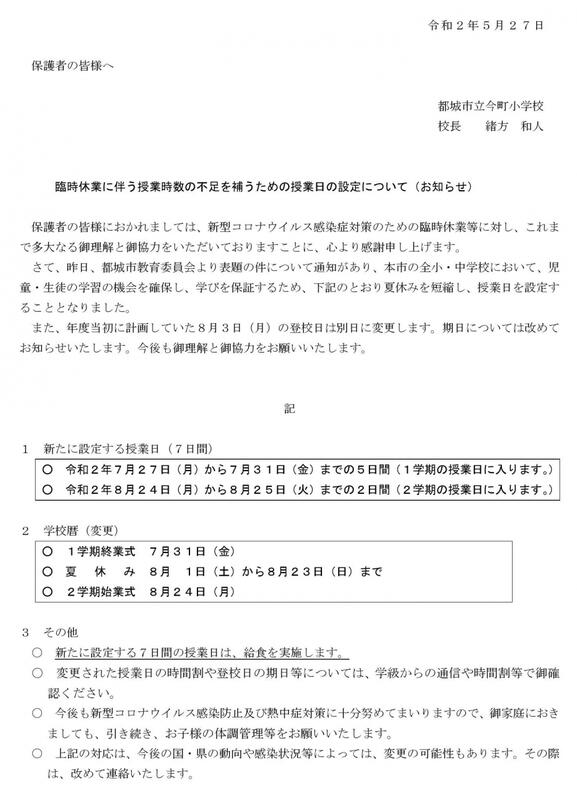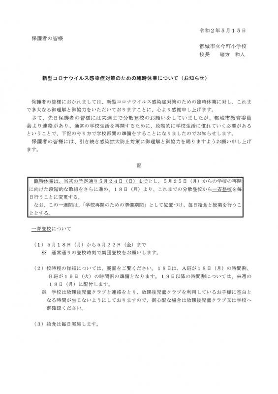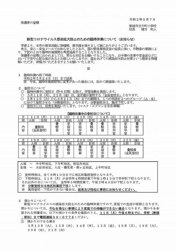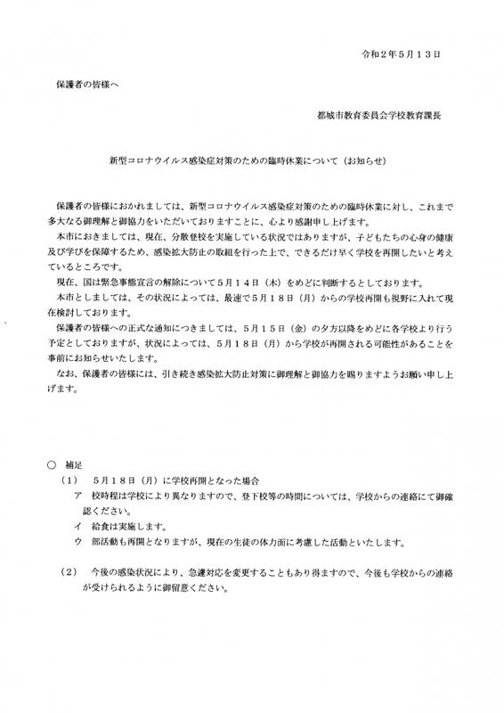 4月16日の国の緊急事態宣言対象地域の拡大に伴い、本校を含め市内全ての小・中学校が、明後日の22日(水)から臨時休業となりました。