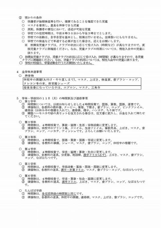 預かりについては、やむを得ない事情により家庭での待機ができない場合となります。預かりを希 望される保護者は、以下の預かりの条件を確認のうえ、明日の21日(火)午後4時40分までに、学校(教頭)まで電話連絡39-0776ください。