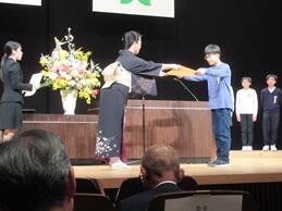都城市教育委員会精励賞の表彰式が行われました。この賞は、市内の小・中学校で他の模範となるような善行・文化活動の見られた個人・団体に授与される賞です。本校の6年生全員が善行部門の団体の部でこの賞を受けることになり、代表児童が表彰状を授与されました。表彰の事由は、6年生が毎朝ボランティアに取り組んでいること、学校行事や委員会活動などに積極的に取り組んでいること、伝統芸能俵踊の継承に取り組んだことなどです。6年生には、この受賞を今後の励みにしてほしいと思います。