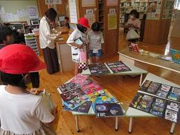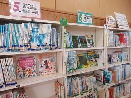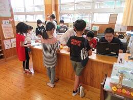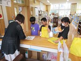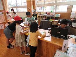 昼休み時間の図書室の様子です。この週は、本を借りてスタンプを集めると人気キャラクターのしおりやファイルがもらえるイベントを行っていました。(キャラクターは使用が認められているものです。)その効果もあり、たくさんの子どもたちが本を借りていました。図書委員会の児童も大忙しで貸し出し処理をしていました。図書室内は図書館サポーターさんがいつも設営を工夫してくださっています。