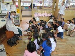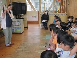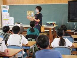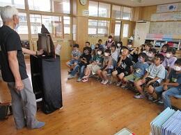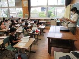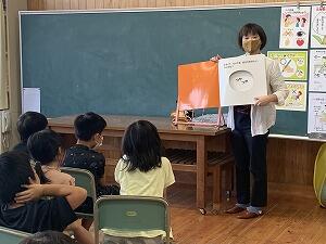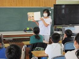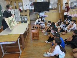 この日は4年から6年の読み聞かせ・紙芝居が行われました。動物の顔の実物大の絵本、文学作品の紙芝居など、ボランティアの方々がいろいろな絵本や物語を準備してくださるので、子どもたちは興味津々で絵本や紙芝居に見入っていました。また、コロナ感染予防の制限が緩和され、絵本や紙芝居を間近で見ることができるようになり、子どもたちは絵本や内容に一層集中しているようでした。