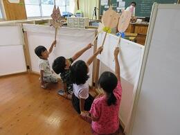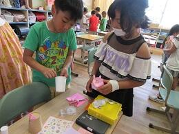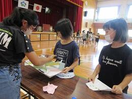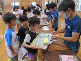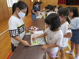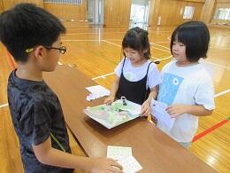 5年生が図画工作科で作った、本体を傾けてビー玉を転がして進める迷路のおもちゃを、1年生・2年生に遊んでもらう異学年交流学習をしました。1年生・2年生は、迷路でゴールすると、5年生からカードにシールを貼ってもらい、色紙で作った飛行機や動物、キャラクターなどの景品をもらってとてもうれしそうでした。遊ばせている5年生もうれしそうに1年生・2年生に接していました。図画工作科で作品を作るだけでなく、異学年交流学習を企画した先生方に感心したところでした。