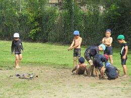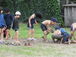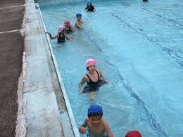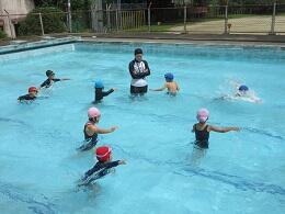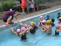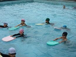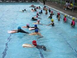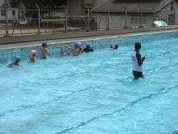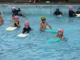 1年・2年の水遊び学習では、先週から大プールの水位をさげて合同で授業を行っています。今週、子どもたちは、1日目は、同じ方向に動いて流れるプールをつくったり、水泳帽の色で鬼ごっこをしたり、水中での宝探しをしたりして、水に慣れる遊びをしました。2日目は、同じ水遊びに加え、ビート板を使って体を浮かして進む水遊びもしました。水遊びの得意な子はもちろん、水遊びの苦手な子も、全員で楽しく遊ぶ中で、少しずつ水に慣れてきているようです。学習中はずっと歓声が響いていました。