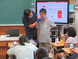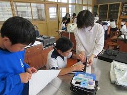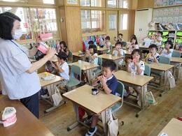 4年では、学校医の歯科医さん・歯科衛生士さん方の協力で、歯磨き指導を行いました。むし歯のできる訳やむし歯になりやすい部分の説明を聞いた後、磨き残しを赤く染める染め出しを使って磨き方の点検をしました。そして、歯ブラシを使って磨き残しの部分を丁寧にみがく練習をしました。子どもたちは、自分のふだんの歯磨きの仕方を振りかえり、磨き残しがないように気をつけようとする気持ちをもつことができました。歯科医さん・歯科衛生士の皆さん、ご指導ありがとうございました。