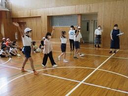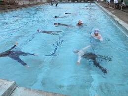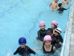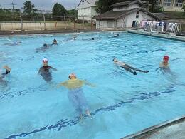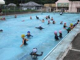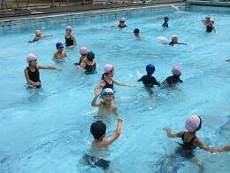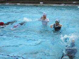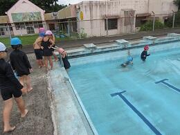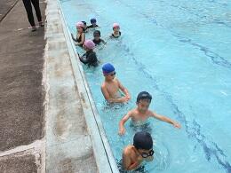 1年生は2週間、水位の浅い小プールで水遊びの学習をしてきましたが、この日は水位を下げた大プールで学習しました。1年生、初めは恐る恐るプールの壁ぎわをつたって歩いていましたが、だんだん慣れてきて、同じ方向に歩いて流れるプールをつくったり、壁ぎわから離れて向こう側まで移動したりしました。最後は鬼ごっこをして遊ぶ様子が見られました。中には泳いだり水中に潜ったり子もいました。