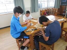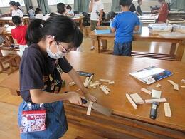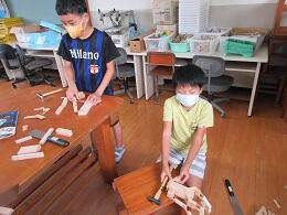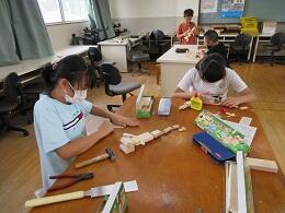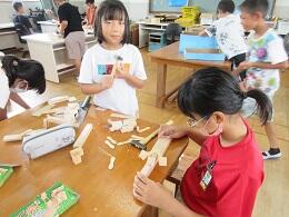 5校時・6校時に2階の図工室からギーギーギー、トントントンと音が響いてくるので見に行ってみると、4年生が工作をしていました。4年生は、のこぎりで板を切ったり、金づちで釘を打ったりして、動くおもちゃづくりをしていました。4年生全員が、ものも言わず自分の工作に集中していました。何ができるのか質問すると、「とかげです」「ウサギです」とうれしそうに答えていました。将来、この中からもの作りをする者がたくさん出るのではと期待をさせるほどの真剣な取組でした。