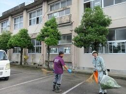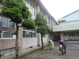 本校の職員・外来駐車場や中庭にあるイヌマキ(ヒトツバ)の木に、今年もキオビエダシャク(羽に紺色に黄色の帯のある蛾)の幼虫(毛虫)がたくさん付いていたので、本校配属の市の技術員に駆除する薬剤を散布してもらいました。また、イヌマキの高い部分の剪定もしてもらいました。おかげさまで、昨年校長一人ではできなかった剪定までできて、駐車場のイヌマキがすっかりきれいになりました。技術員の職人技に感激したところです。毛虫もいなくなり、安心して車を停めることができるようになりました。