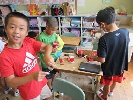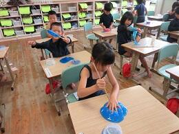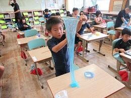 1年の教室をのぞいたところ、面白そうなことをしていました。ネバネバしているけれどもベタつかない「スライム」を作って遊んでいました。1年生は、一人一人好きな(?)色に、中にはキラキラするラメを混ぜてスライムを作っていました。その後、机の上に広げたり、自分の手に巻き付けたりして、スライムの感触を味わっているようでした。(学級担任の配慮で、服を汚さないように水泳着に着替えて活動し、活動後の次の学習はプールでの水遊びでした。)
