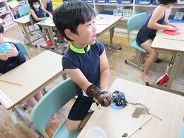 1年生は、1日の中でいろいろな学習をすることがあります。この日1校時は、生活科の学習で、雨上がりの運動場で「どろんこ遊び」をしました。子どもたちは、運動場の水たまりのドロをすくったり、ドロの上に寝転んだりして遊んでいました。もちろんその後はプールのシャワーできれいに洗い流しました。また、午後には、学級活動の学習で、保健室の先生から「歯の上手なみがき方」を教わりました。子どもたちは手鏡で自分の歯を見ながら、歯の汚れがたまりやすいところをしっかりとみがく練習をしました。