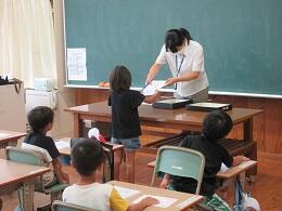 1学期の終業式はインフルエンザ蔓延防止のため、映像によるリモート方式で行いました。2年生の代表児童が「1学期を振り返って、頑張ったことやできるようになったこと」を発表しました。振り返りがきちんとできていました。終業式の後、各学級では学級担任の先生から児童一人一人に「通知票」が手渡されました。通知票を受け取った子どもは、1学期の成績に見入っていました。中にはうれしそうに笑顔を浮かべる子もいました。夏休みは、健康に、安全に過ごしてほしいと思います。