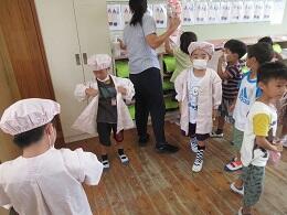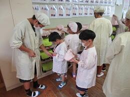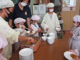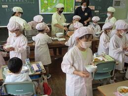 1学期は6年生にしてもらっていましたが、2学期からは1年生が自分たちで給食当番をしています。給食当番は、給食エプロンを身に着け、給食コンテナ室から食缶や食器などを運び、教室ではご飯やおかずをつぎ分け、全員に配膳していました。難しいところは6年生に助けてもらいながら、一生懸命取り組んでいました。幼稚園や保育園でも経験があるようで、要領はわかっているようでした。それでもできることは自分たちでするということはとても大切なことです。これからも頑張ってください。
