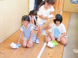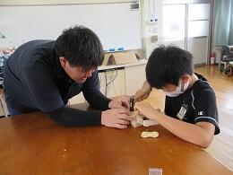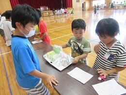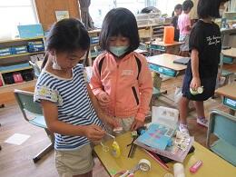 校内を見回っていると、2年生が生活科の学習で、おもちゃを一生懸命に作っているところでした。紙コップに輪ゴムを張って飛び上がるおもちゃ、乾電池をおもりにゆらゆら揺れるおもちゃ、紙箱にストロー・竹ひご・ペットボトルのキャップで車輪を付けて走る車のおもちゃなど、いろいろなおもちゃを2年生が楽しそうに作っていました。おもちゃが出来上がると、考えたとおりに飛び上がるか、揺れるか、走るかを何度も試していました。この後は、このおもちゃで1年生といっしょに遊ぶのだそうです。