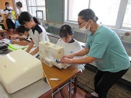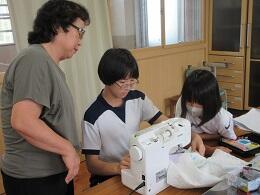 6年生の家庭科では、修学旅行で使用するナップサックを作成しています。この日からミシンを使用するため地域の方に依頼したところ、6名の方がボランティアで参加してくださいました。1台のミシンにお一人ずつボランティアがついてくださるので、子ども達も安心してミシンで作業をしていました。ボランティアの皆様、本当にありがとうございました。