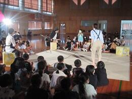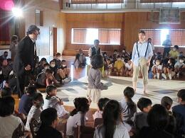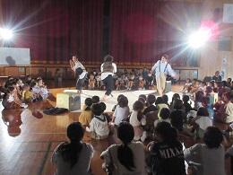 劇団こふく劇場さんに来ていただき、5年・6年のワークショップと全学年で「どんぐりと山猫」(宮沢賢治作)の演劇鑑賞を行いました。5年・6年のワークショップでは、活動を通して言葉で伝えたり全身で表現したりすることの大切さを学びました。全学年の演劇鑑賞では、途中、どんぐり役で台詞を言う児童8名と、「わいわいガヤガヤ」と騒ぐ場面では全児童が演劇に参加しました。役者さんの迫力ある演技と、児童の参加でたいへん盛り上がりました。劇団こふく劇場様、ありがとうございました。