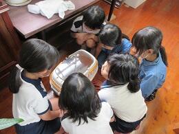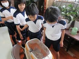 朝、子どもたちが登校してくる時に、近所から学校の敷地内に子ネコが入ってきて、気づいた数人の子どもたちが騒いでいました。校長が捕まえて出てきたと思われるところに帰そうとしましたが、おなかがすいているのかミャーミャーと鳴いて離れようとしません。そこで、しばらく学校で保護することにしました。休み時間に、1年生や2年生、子ネコのことを知った子どもたちが、代わる代わる見に来て、「かわいい!」「ほしい!」と大騒ぎ。結局、子ネコは、職員の親族の方にもらっていただくことになりました。