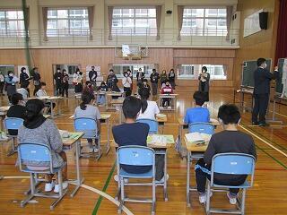 参観者が多数いたため、図書室と体育館で授業を行いました。