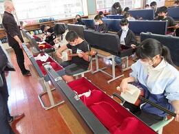 6学年では、総合的な学習の時間に日本の楽器「三味線」の演奏について学習をしました。本校では、高学年児童が伝統芸能の俵踊りを練習して運動会で披露していますが、その練習や本番で踊りの伴奏をされている三味線演奏者に、授業の講師として来ていただきました。三味線の構えやバチの握り方、弾き方などの基本を教わり、6年生は真剣に演奏に取り組んでいました。