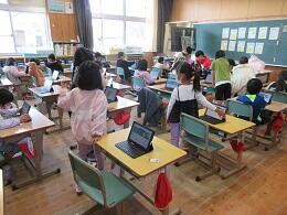 先日始業式があり、1学期が始まりました。1学期2日目の朝、校門では「あいさつリレー」が始まりました。このあいさつリレーは、コロナウイルス感染対策のため数年間中止していましたが、新年度に再開することにしました。先に登校した班の児童が、後から来た児童に元気よく朝のあいさつをします。学校の一日の始まりです。各学年学級では、新しい担任の先生との授業が始まりました。授業のはじめに、授業の準備、返事の仕方、発表や話の聞き方など基本的な学習習慣を指導していました。