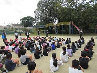 都城警察署の方に来ていただいて、不審者が学校に来たときにどういう避難をするのかを考えて行動する避難訓練を行いました。事前に避難経路、避難先を確認して訓練を行いました。子どもたちは、落ち着いて避難していました。