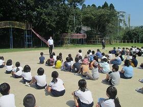 学級で風水害についての指導を行い、その後、地区単位で時間差を作りながら集団下校を行いました。