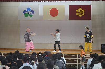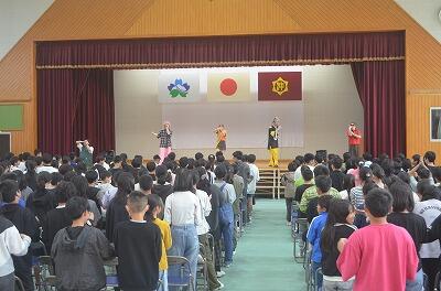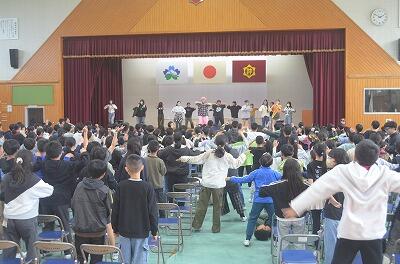 3月19日(金)に、みやこんじょ大使でもある「じゃーんずΩ」のメンバー6名のうち5名が、来校されライブをしてくださいました。