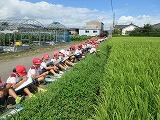 9月6日(木)3時間目に、実習田の苗の観察をしました。地域の方のご協力のおかげで、まっすぐ伸びた緑の苗が、風にそよぐ様子は見事でした。先週は、花が咲いていました。秋の深まりにつれて、苗は静かに頭を垂れていくのでしょう。真剣な顔で、苗の観察をすることができました。