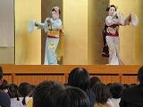 お昼休みには、沖水小学校出身の二人の舞妓さんが、体育館で京踊りを披露してくれました。たくさんの子どもたちが、あでやかな踊りにうっとりしていました。振袖や髪飾りについての説明もありました。