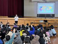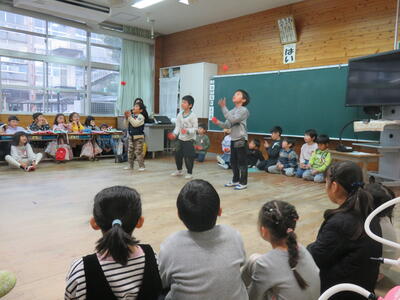 中国、モンゴル、アメリカの交際交流員の方が来られ、それぞれの文化や生活、簡単なあいさつやクイズなど、子どもたちは目を輝かせながら学んでいました。