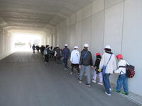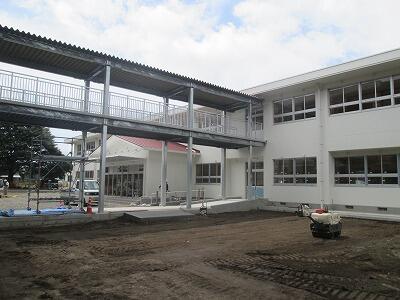 これは、校舎間をつなぐ廊下とエレベーターの工事部分です。渡り廊下部分を校舎内からのぞくと・・・