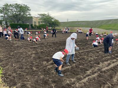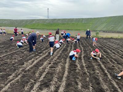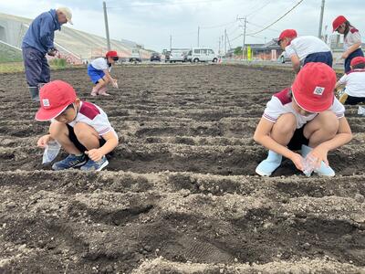 子どもたちは、高齢者の方々から植え方の説明を聞いて、一緒に作業をしました。