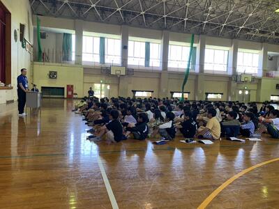これは3年生です。体育館で非行防止教室の授業を行いました。外部講師として都城警察署の方に来ていただきました。