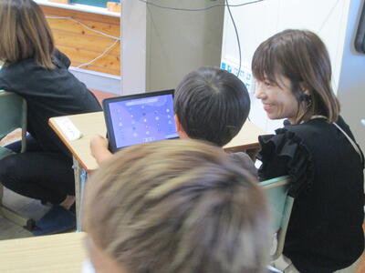 写真は1年生の参観授業の様子です。1年生は10月からタブレット持ち帰りの学習を始めるため、参観日の時間を利用して親子で学ぶ時間の設定しました。家庭でのタブレットの使い方、持ち帰りの仕方、学習ソフトの使い方など動画や学習ソフトを使って進めていきました。学級によっては親子一緒にタブレットを使って確かめる時間も設定し、学習を進めていました。