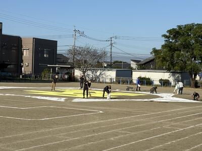 校旗のマークをデザインされた県土地家屋調査士会の方々とPTAで運動場の校旗マークカラー石灰で準備していただきました。