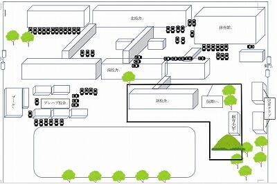 作業着を着ています。校舎の方を凝視しています。はい。そうですね。先日お知らせした新校舎建築の工事関係者です。先ほどの紐は、これから新校舎が立てられる場所を示したものなんです。新校舎は下の図にあるように小運動場に建設予定です。