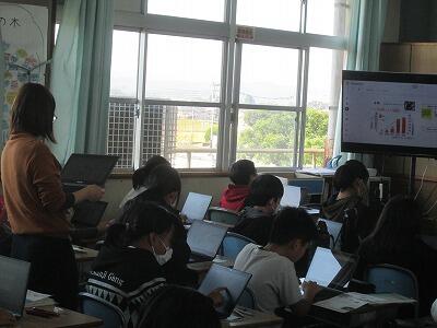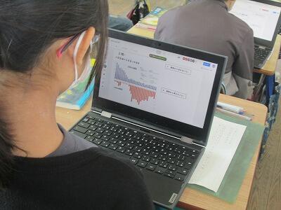 このようになっています。今日の学習は資料を見て分かったことを整理し、それをもとに自分の考えを書くというものです。先生は一人一人の学習状況を見ながらアドバイスしたり、次の写真のように大型モニターに映し出して、みんなで共有させたりなどしています。