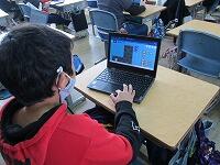 4年生がICT支援員の先生と一緒にプログラミング学習をしました。初めての学習だったので、プログラミングでどのようなことが出来るのか説明を受けた後、プログラミング教材を使って実際にプログラミングをしていきました。